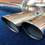 Enlarged pipe cross-section, inlet Ø 70 mm, double tailpipes left / right with Ø 2x84 mm each, end tubes rolled up and beveled (approx. 19 °) with OETTINGER lettering.