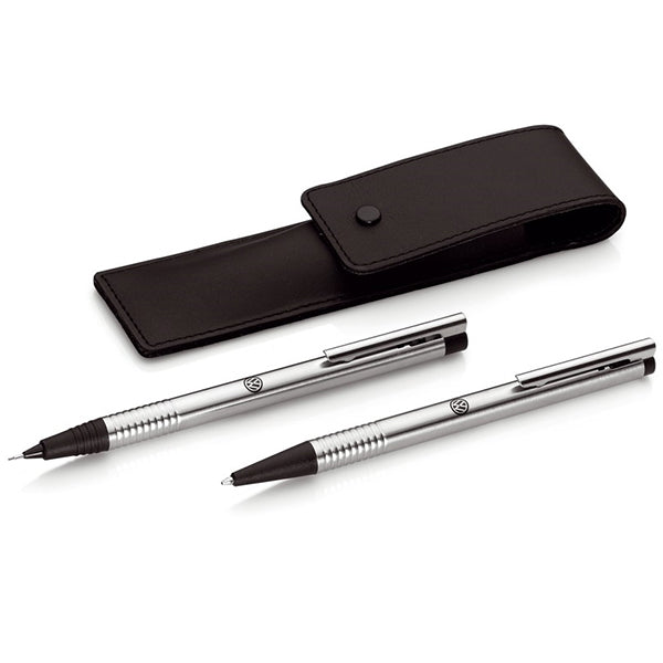 Lamy ball-point pen and mechanical pencil set with leather case, Logo 205 / 105 model, matted stainless steel, includes black large-volume cartridge for the ball-point pen and HB leads for the mechanical pencil, with Volkswagen Aktiengesellschaft logo, advertising material collection. Metal. Matt Silver.