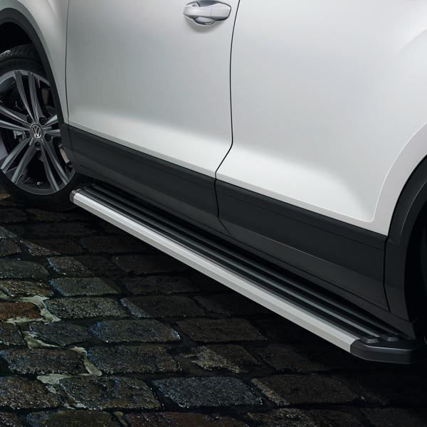 Running boards underline the SUV character of your vehicle and also make entry to the vehicle and loading of the roof easier for you at the same time. The running boards are manufactured from silver-anodised aluminium and are closed on the side with black plastic end caps. Incorporated into the step surface are black plastic inserts that create an anti-slip effect for safe entry to the vehicle. Also for R-Line USP overview: -All necessary attachment parts included -Anti-corrosion coating -Carrying capacity 200 kg per board -Side collision requirements met -Compatible with wheel housing extension.