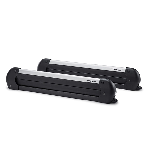 The Volkswagen Genuine basic ski and snowboard carrier can carry up to 4 pairs of skis or up to 2 snowboards comfortably and safely on your vehicle roof. The ski and snowboard carrier is easily mounted on the roof rack (T-groove attachment) and can be locked. The wide opening button means the ski carrier can even be operated when wearing thick ski gloves. The skis or snowboards are wedged between two protecting rubber profiles. The carrier is City Crash tested.